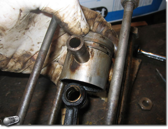 Ensuite, démontage du piston… mais je vais vous expliquer pourquoi: aussi étrange que cela puisse paraître, il faut déposer le piston afin de pouvoir sortir l’embiellage du moteur!!! On comprendra mieux en image dans l’étape suivante (ben oui, faut être patient en restauration de moteur).